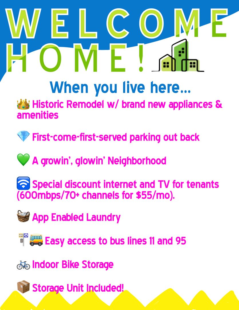 Off-street parking option out back but holy moly, you might just be biking all over your new fav. neighborhood, or hopping on the Bus that stops right out front! The convenience is- ahem- fuqqin' nutz. GREAT places to eat line the street; check out Bud's Pizza, The Golden Hoosier, Piper's Coffee. Then there's also Planet Fitness, Walgreens, and seafood spot all within a few lil Polly Pocket steps of your place!